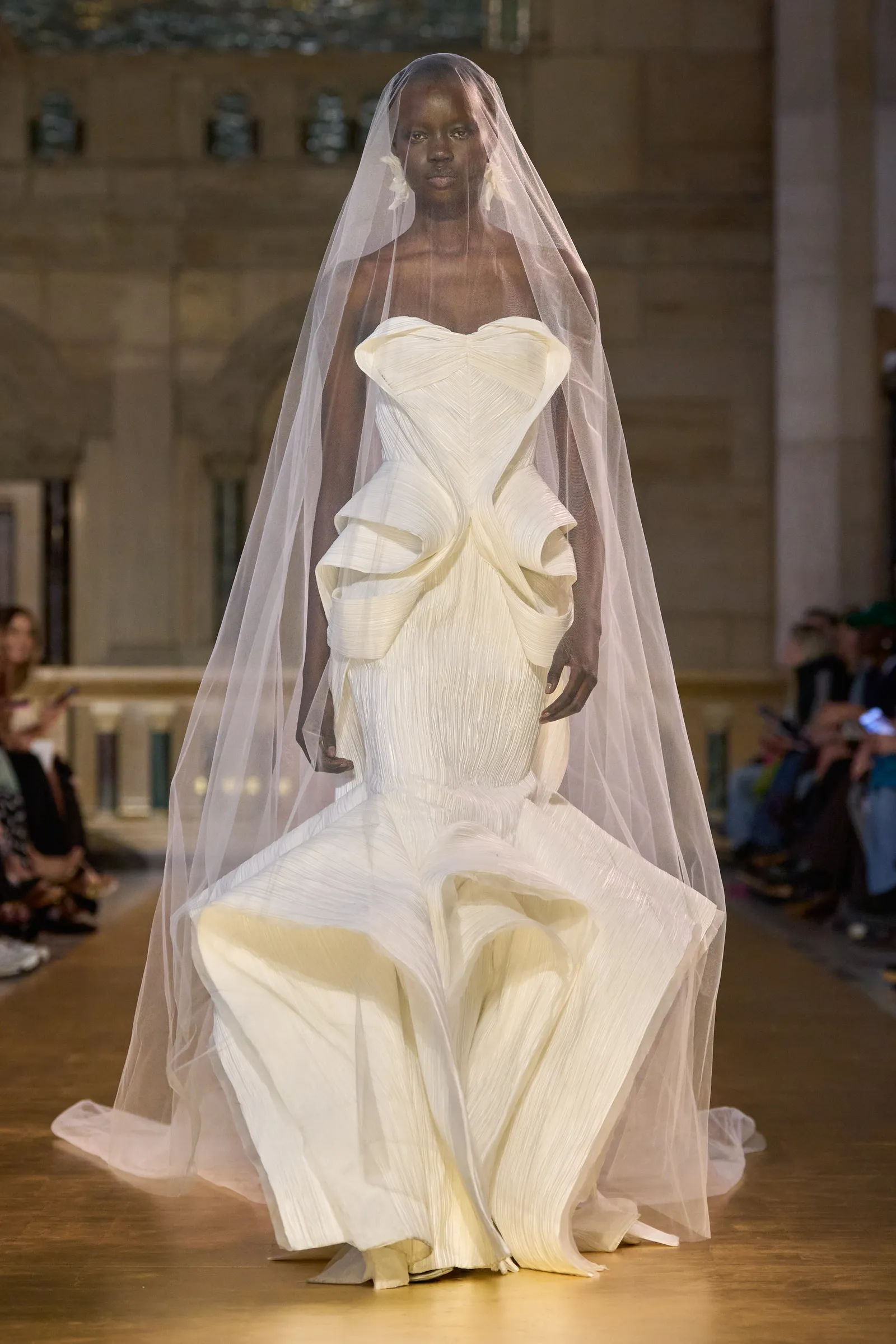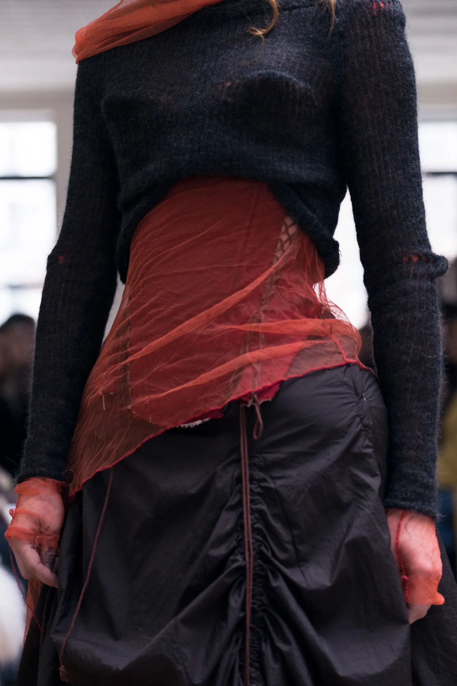 There was something disarmingly personal about this show. As if we weren’t attending a runway, but stepping into a private ritual. The collection revolved entirely around the body. Corsetry felt less about control and more about awareness; draping followed movement rather than imposing shape. And then the bath finale came… Whalen stepping into water at the runway’s edge didn’t read as shock, it read as release. A cleansing, a reset, a deliberate statement that vulnerability is not weakness but authorship. The runway became an intimate theater, where the audience wasn’t just observing fashion but witnessing it.